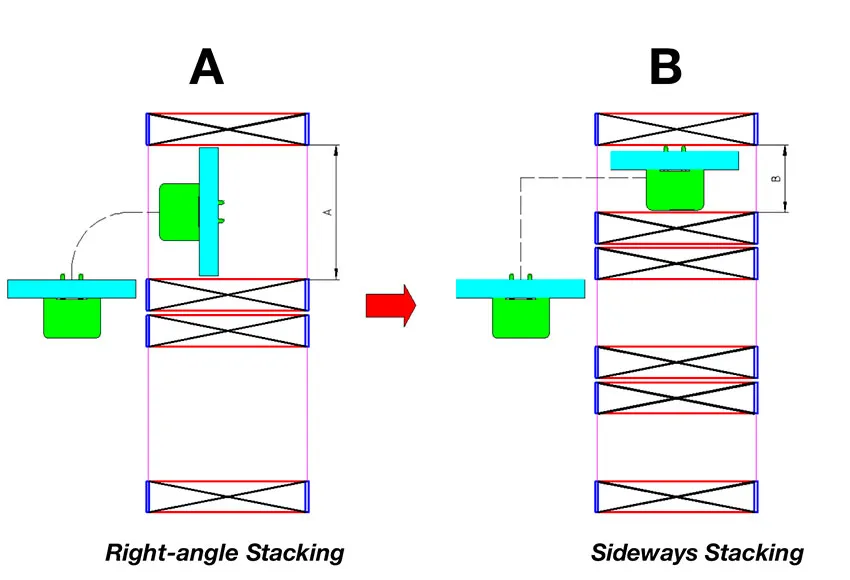 With the implementation of sideways mode, the aisle width can be significantly reduced from A to B, greatly increasing warehouse utilization efficiency.