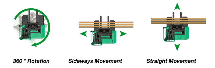 The X series electric four-way reach truck offers three flexible modes: 360° rotation, sideways movement, and straight movement, suitable for narrow aisles and limited spaces.