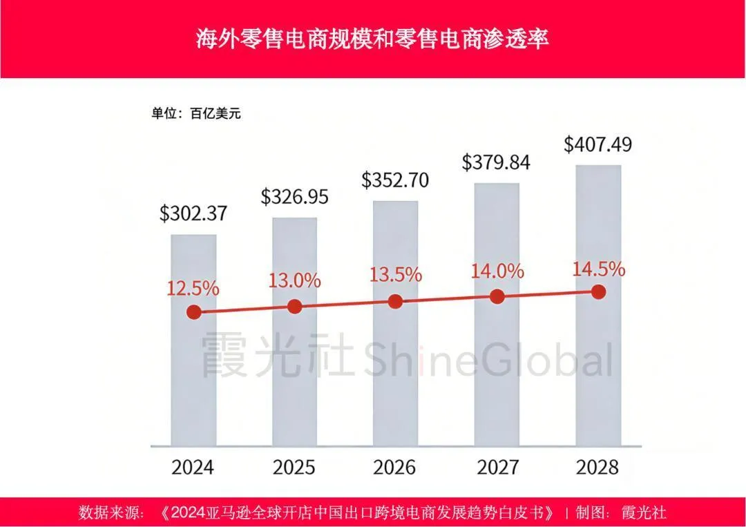 这是一个机遇与挑战并存的时代:一方面,亚马逊发布的《2024亚马逊全球开店中国出口跨境电商发展趋势白皮书》预测,2025年海外零售电商规模将达到3.27万亿美元,渗透率达到13%左右,这两项关键数字将在2028年进一步提升到4.07万亿美元和14.5%,行业增速仍然可观;另一方面,品牌在产品、供应链、全球布局等方面都迎来新的能力升级窗口。