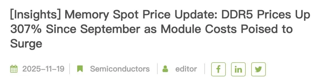 据TrendForce数据显示,2025年9月以来,DDR5颗粒现货价累计上涨约307%,部分媒体走访称,顶配高容量服务器内存单条价格更是突破4万元。