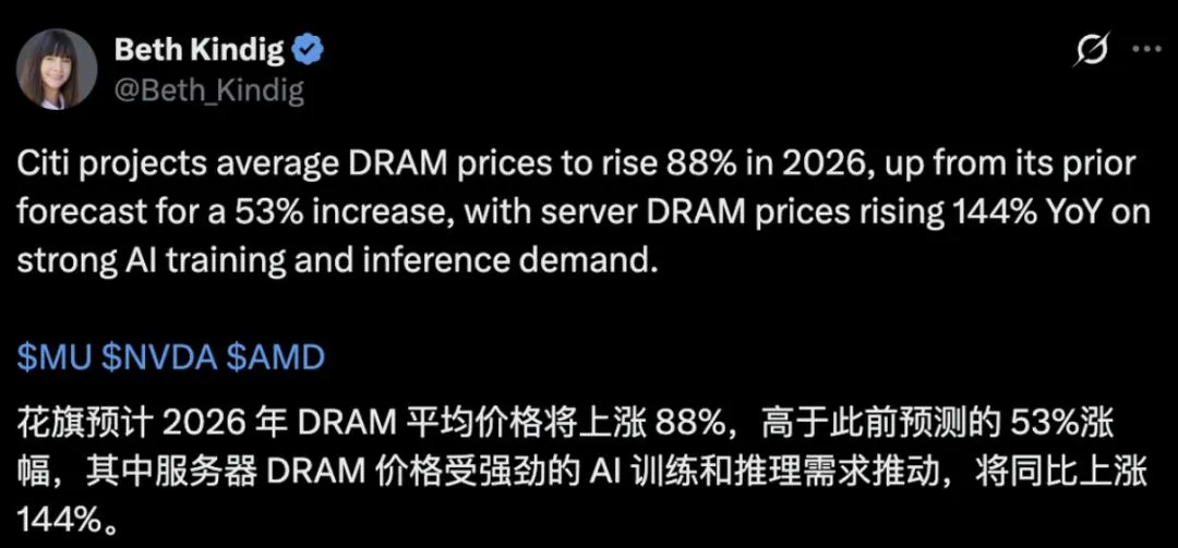 花旗银行的*新研报发出预警:2026年DRAM(动态随机存取存储器)平均售价同比或将上涨88%!