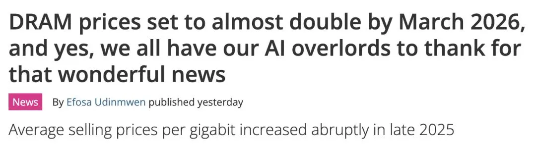 TechRadar近日的报道也佐证了这一趋势:受AI数据中心无底洞般的需求驱动,DRAM价格预计在2026年3月将接近翻倍。